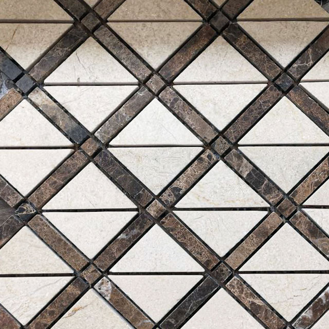 Dark Emperado Creama Marfill Mosaic is a mosaic that is especially good for Interior & Exterior Decoration, Backsplashes, Feature Walls, Floors, Bars, Stairs and other design projects. Dark Emperado Creama Marfill Mosaic can be processed into Honed, Aged, Polished, Sawn Cut, Sanded, Rockfaced, Sandblasted, Bushhammered, Tumbled and so on.